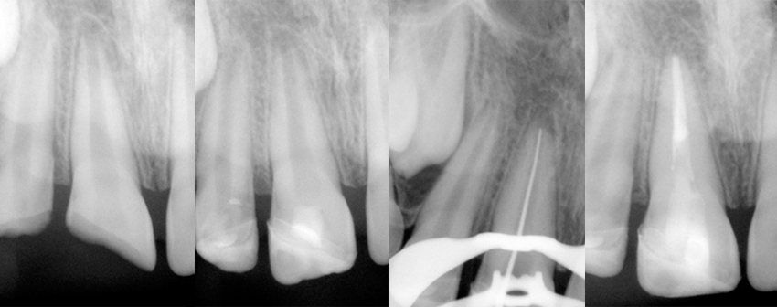 Il centrale aveva l’apice radicolare non formato e si è proceduto con un incappucciamento diretto per favorire il completamento della formazione dell’apice radicolare (apicogenesi), evitando una difficile chiusura dell’apice (apecificazione), poi il restauro è eseguito utilizzando i frammenti dentali stessi recuperati dai genitori ed infine a distanza di tempo viene effettuata la corretta terapia canalare e la ricostruzione in composito.